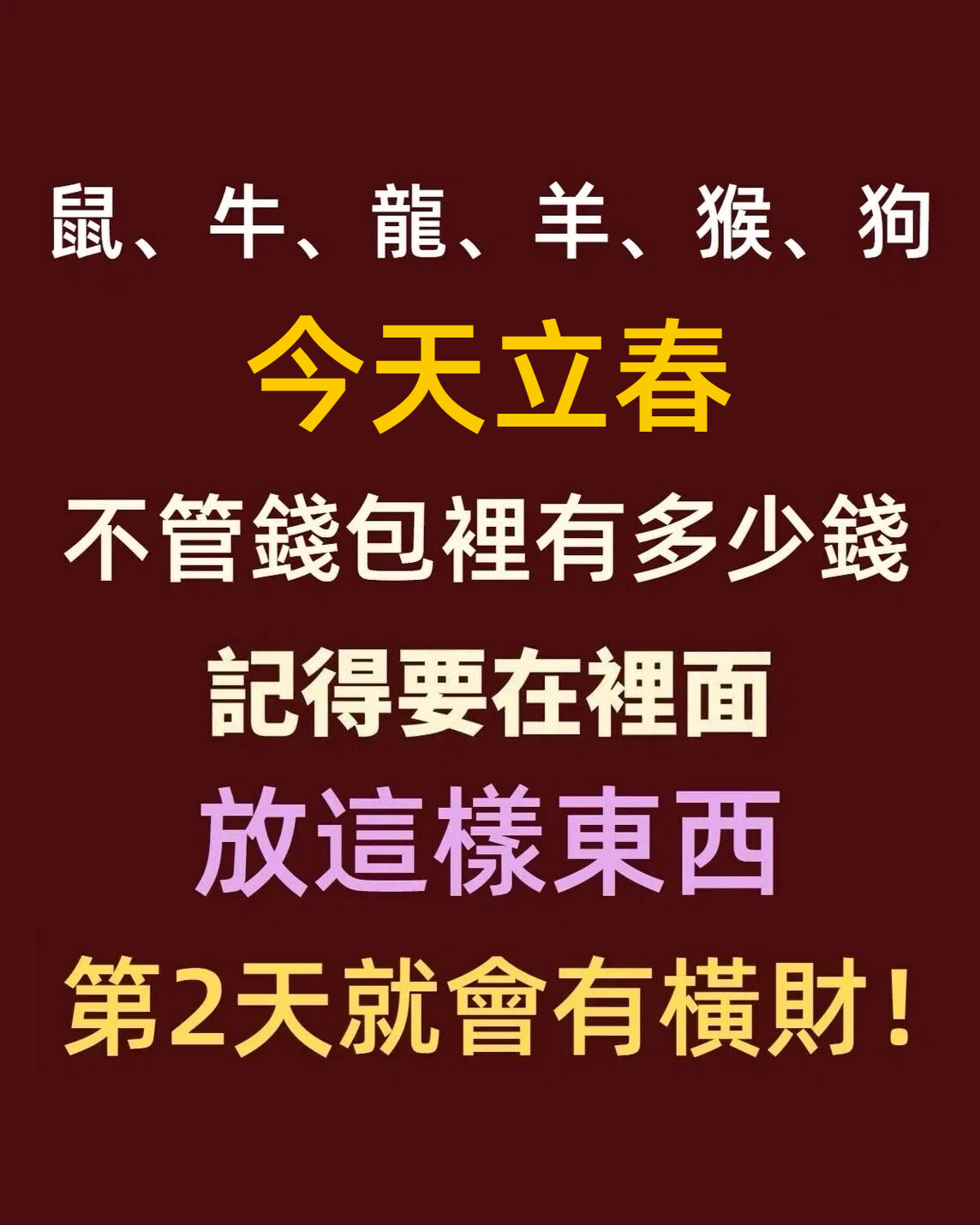 今天是立春,代表一年財氣正式啟動。命理上,立春不只是換節氣,更是「財運重置日」,尤其對屬豬、雞、虎、