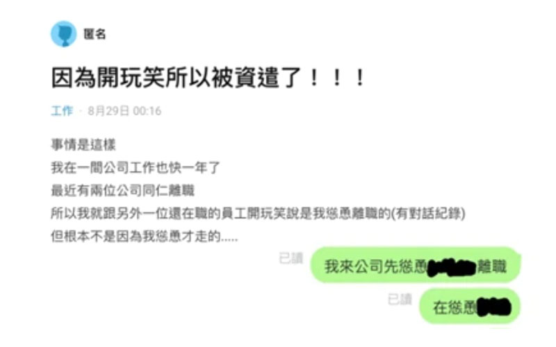 話不能亂講!一名網友在社群平台Dcard發文,自己跟同事開玩笑,說有兩名