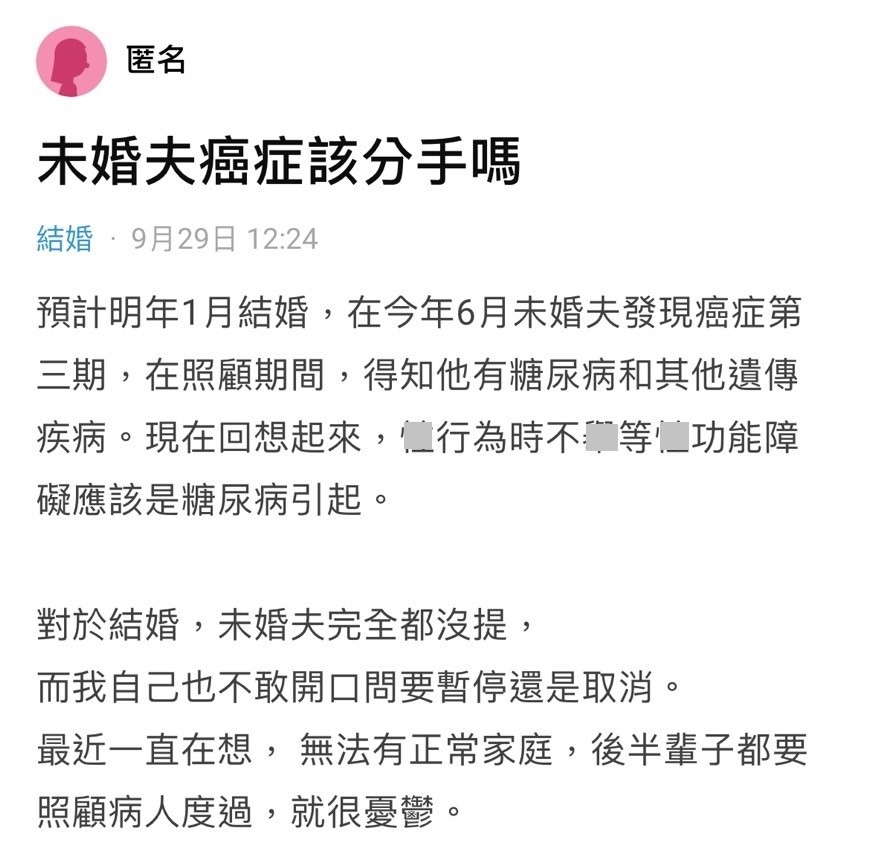 未婚夫得癌症「該提分手嗎?」不想下半輩子都在照顧病人「又怕成罪人」 有一位女網友在《Dcard》表示