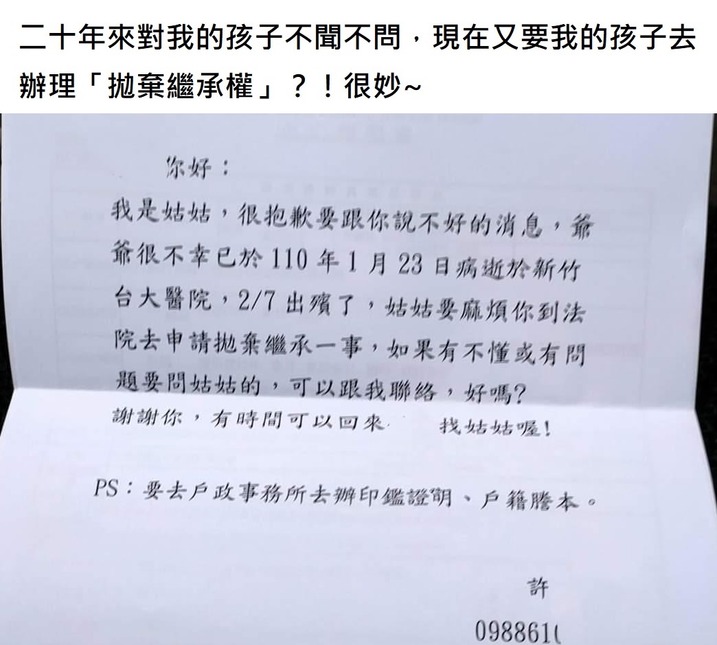 離婚20年,前夫家對孩子不聞不問,卻收到掛號信 竟是要孩子「拋棄財產的繼承權」 日前有女網友上網爆料