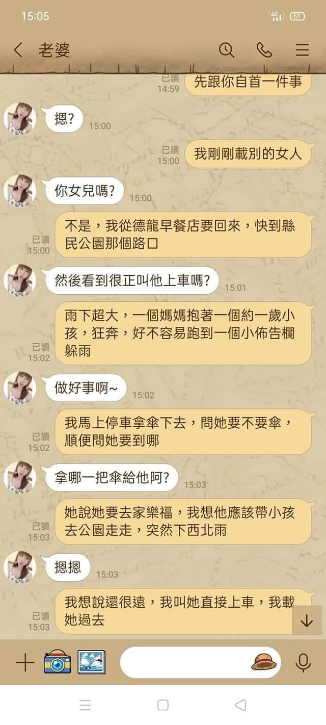 網友在臉書社團上發文: –老公突然傳訊自首:我載了除了你以外的其他女人上車…