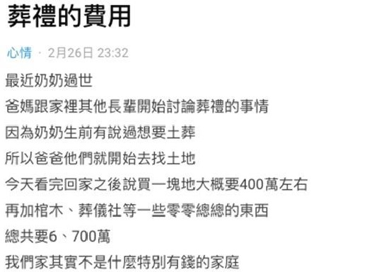 生命有盡頭,很多老一輩希望自己離開的時候能夠走得風風光光。一名女網友在論壇Dcard表示,前陣子奶奶
