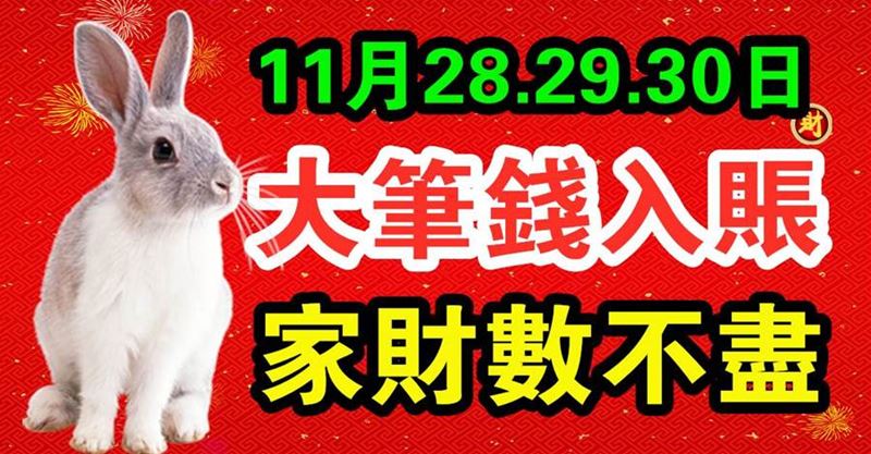 生肖兔 生肖屬兔的人年輕時辛苦勞碌,11月28.29.30日開始喜從天降,橫財大發,存款過7位數,一