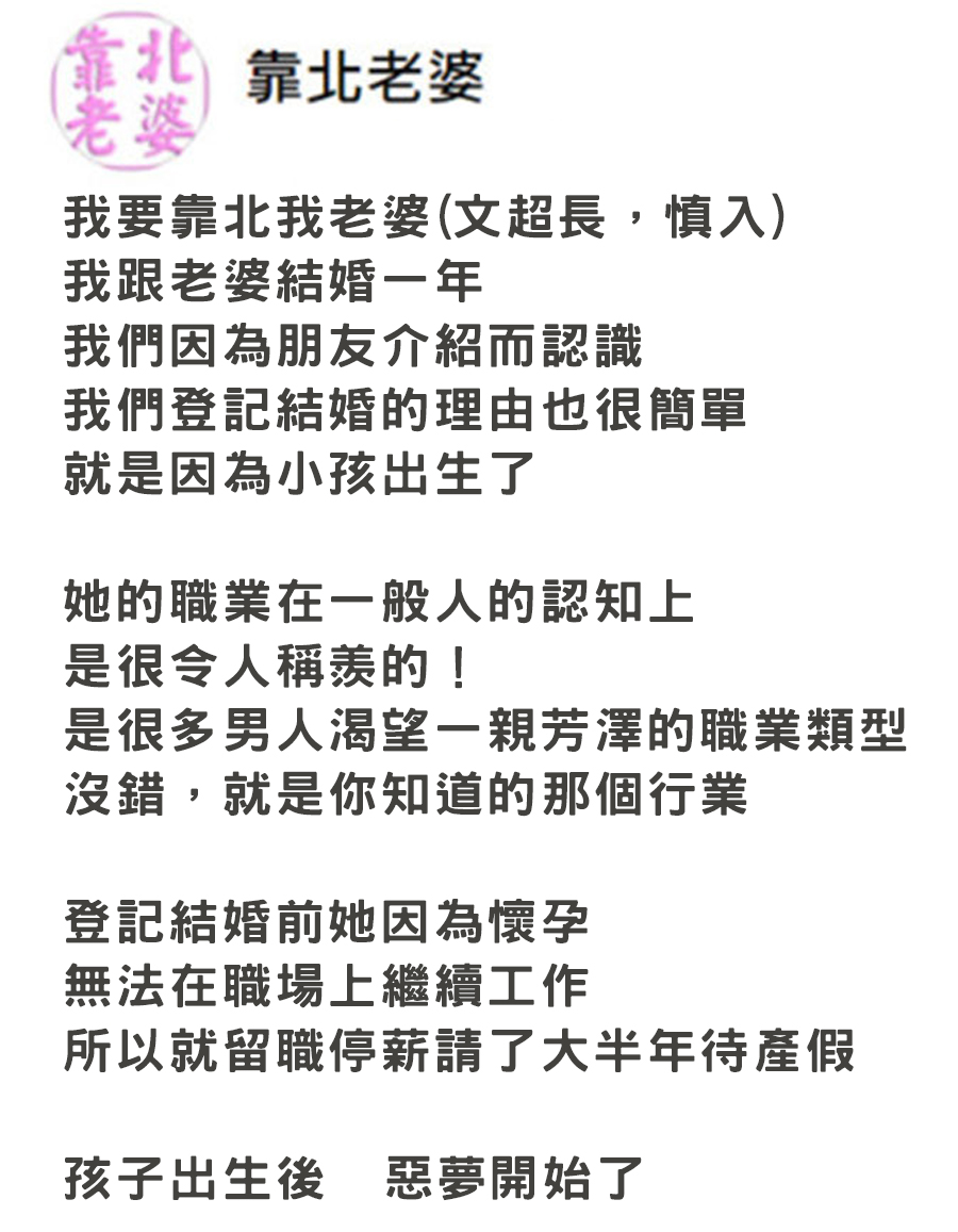 男網友在FB靠北老婆專頁上PO文說,自己是一人公司負責人,靠接案可以月入達400K,透過朋友介紹娶了