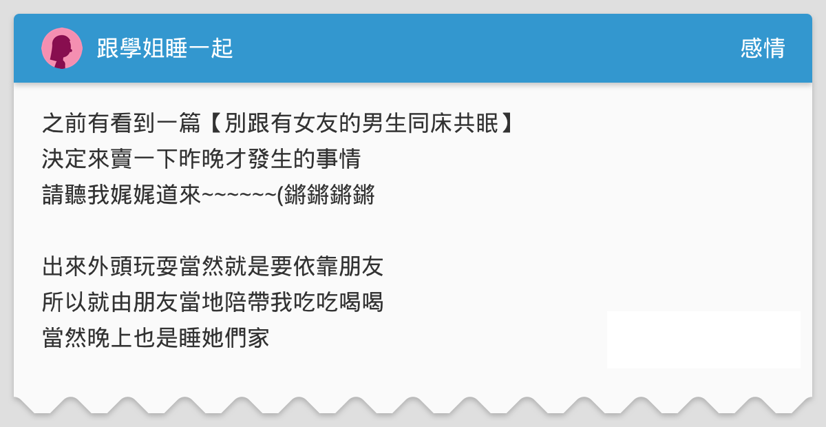 一名網友在臉書粉絲團發文,分享自己錯失一段「良機」的故事,「學姐家是開民宿的,在我老家那也有他們家的