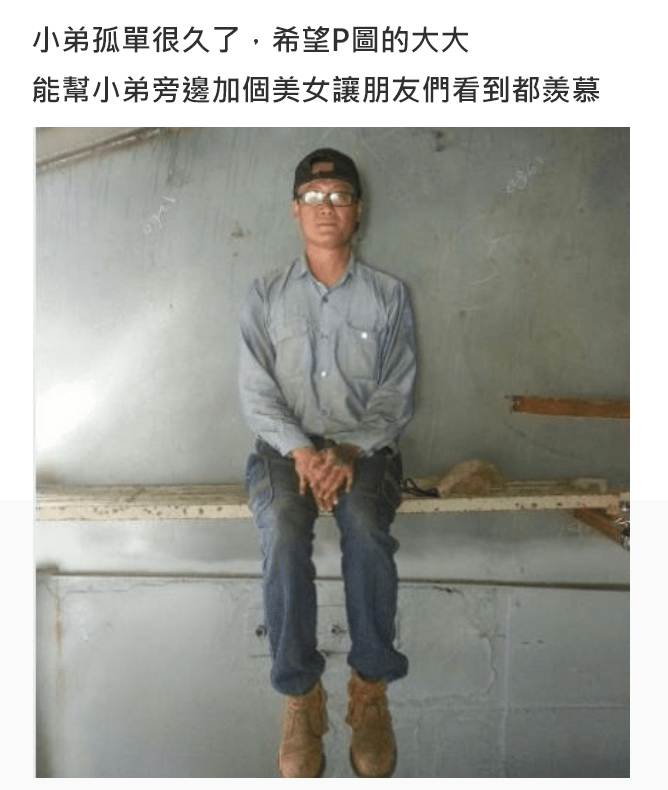 網友在臉書社團上貼出一張圖…並表明 小弟孤單很久了 希望P圖的大大 能幫小弟旁邊加個美女