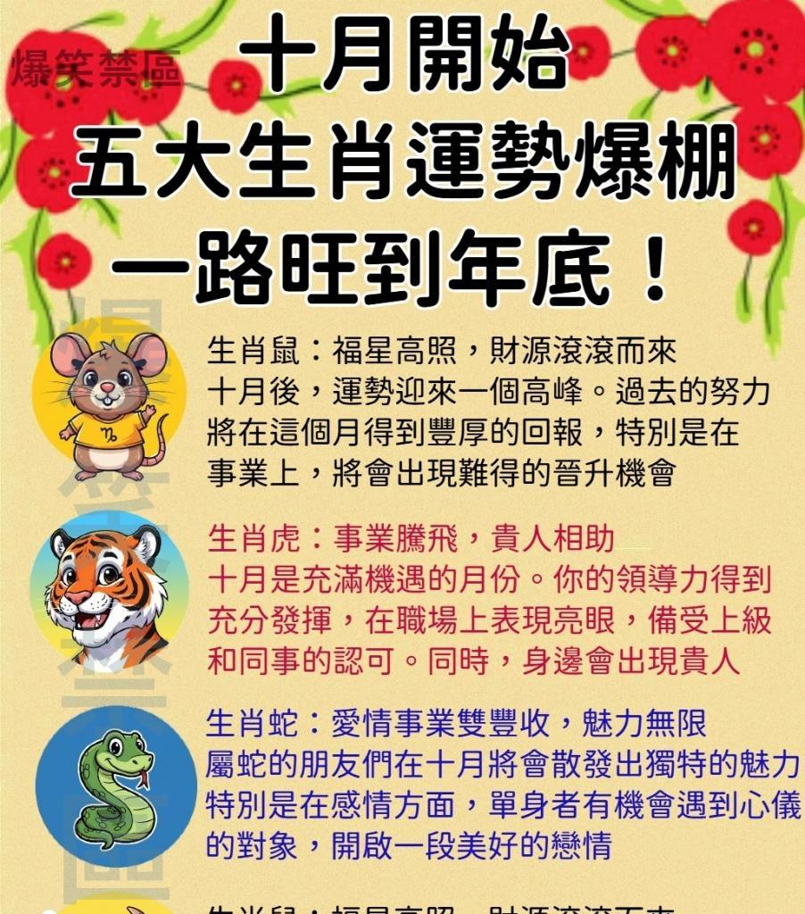 隨著秋意漸濃,許多生肖的運勢也將迎來大翻轉!從十月開始,有五個生肖將會如魚得水,無論是事業、財運還是感情,都將一路高歌猛進,好運氣將持續到年底。快來看看,你是不是那個被幸運之神眷顧的人吧!