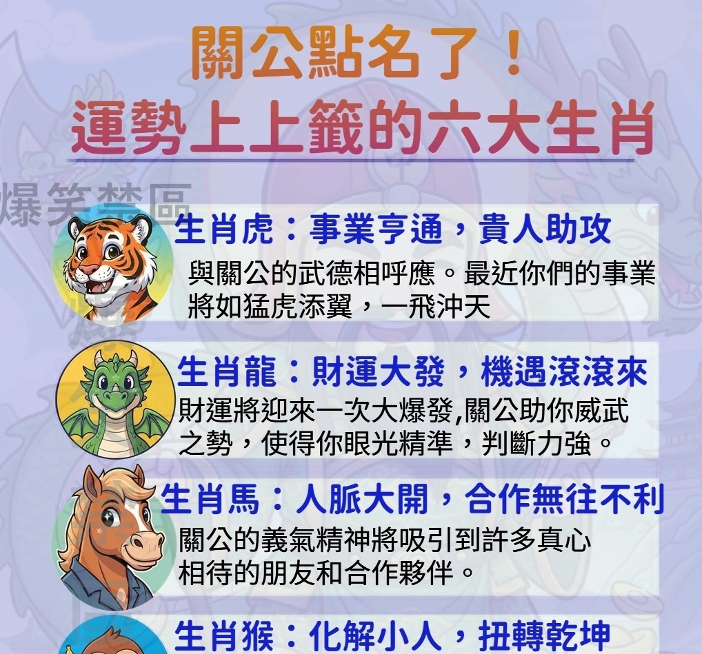 關聖帝君素以忠義、武勇著稱,同時也被尊為武財神和守護神。如果你感覺自己最近做事有如神助,或者即將面臨重大機遇,恭喜你!以下六個生肖已被「關公點名」,即將迎來運勢上上籤,事業、財富、人際全面亨通!
