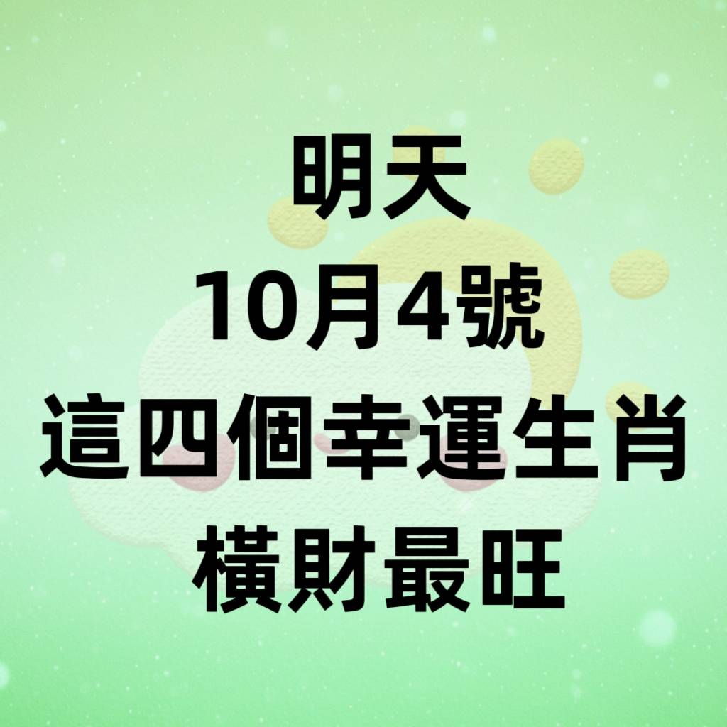 各位準備好了嗎?明天,國曆10月4日(週六),是迎接週末和財運的吉日!根據星象和生肖流日運勢分析,有四個生肖將獲得財神爺的強力眷顧,橫財運勢將達到頂峰!請務必把握這難得的機會,小試手氣,迎接意外之財!