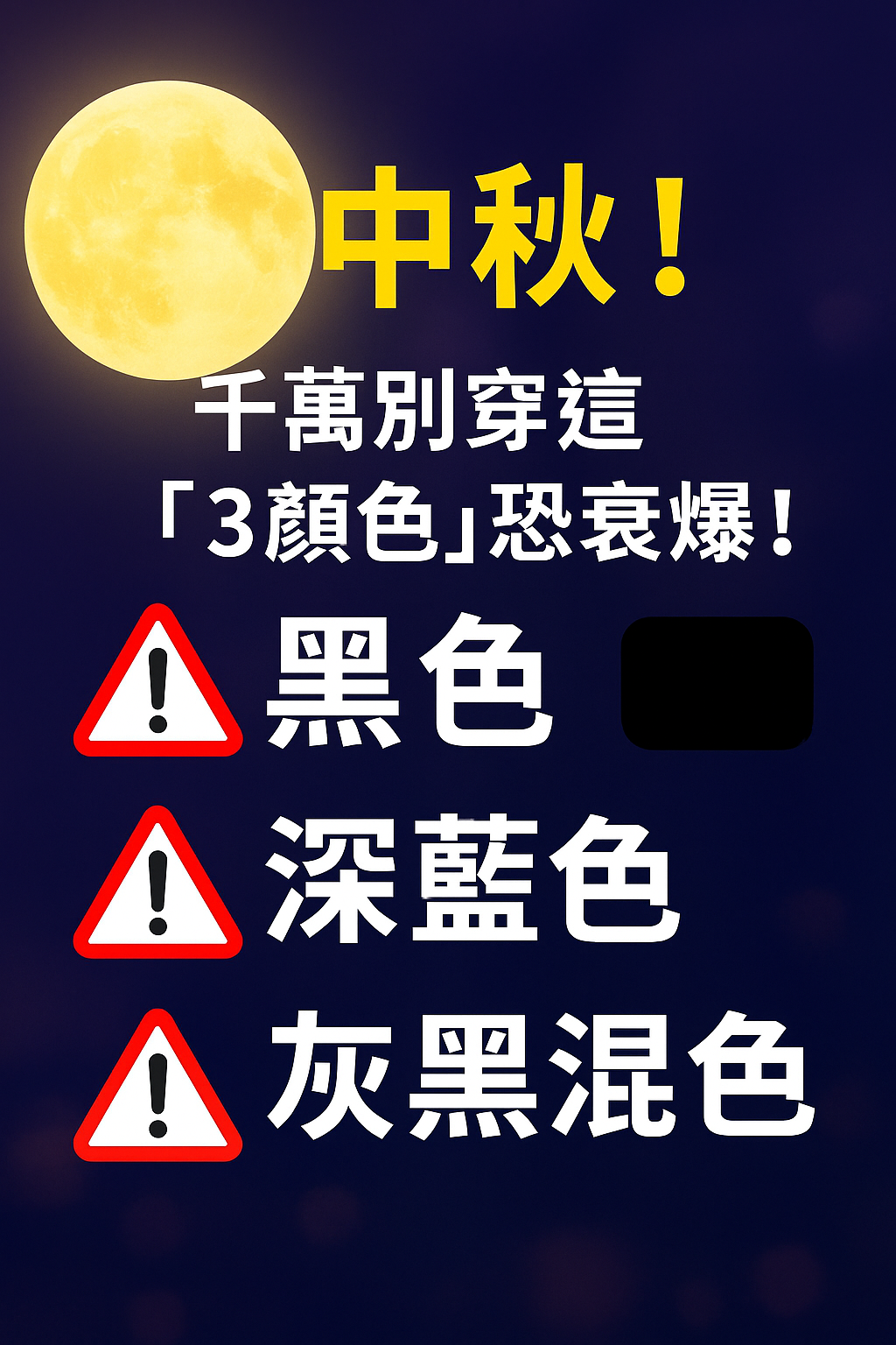 命理師指出,若在中秋夜穿黑色衣物,容易吸引陰氣、破壞自身磁場,導致做事不順、心情煩躁,甚至與家人爭吵。
