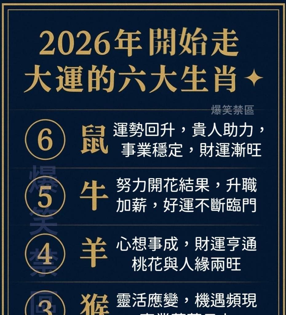 大運表現: 你的人際關係和個人魅力達到巔峰,這將直接帶來合作、投資和感情上的好運。財富將透過合作分紅、投資收益或人脈引薦持續湧入。 2026 年的好運氣場將為屬羊人未來 2−3 年的幸福與財富奠定最美好的基礎。