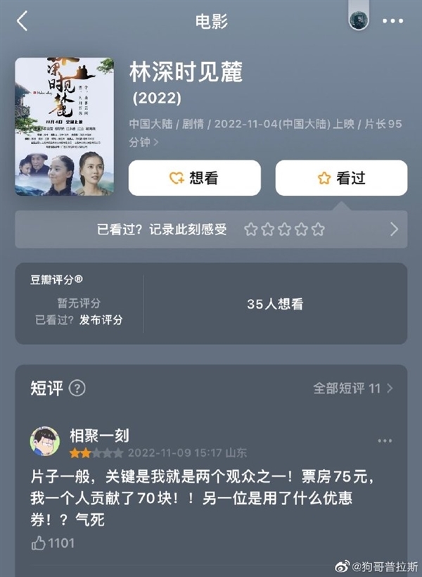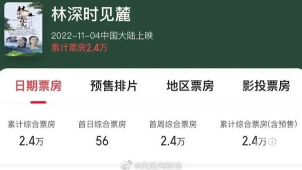 根據中國媒體《天目新聞》報導,《林深時見麓》是一部小成本製作的電影,從策劃、拍攝、後期到上映整整花了 3 年時間。故事講述少數民族與山區居民之間互動的溫暖情節。沒想到電影上映首日,網路上卻傳出「全場只有 2 人進場」,票房僅 75 元人民幣(約新台幣 328 元),甚至還有網友自爆「我就是那位觀眾之一」,但他其實沒進場看,反而只貢獻了 5 元的退票手續費。