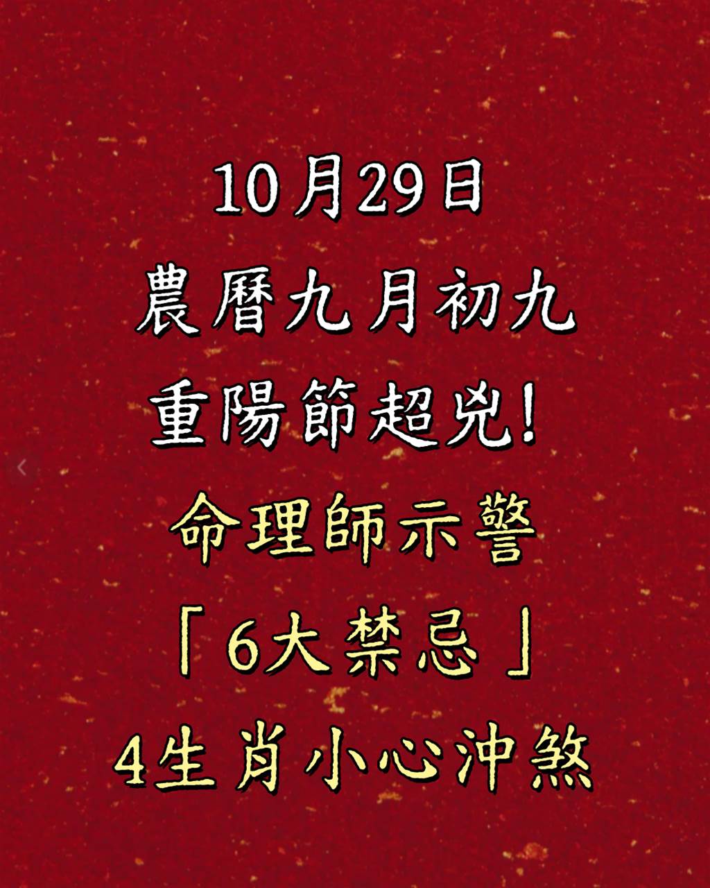 10月29日就是農曆九月初九重陽節,命理專家「清水孟國際塔羅小孟老師」特別點名4生肖,重陽節當天容易沖煞,外出需格外謹慎。