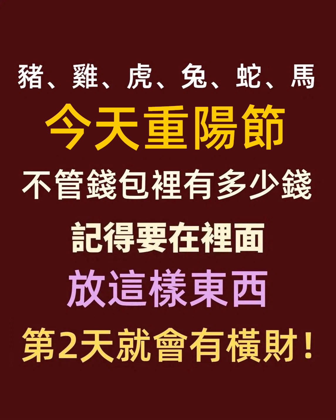 重陽節除了登高、賞菊,其實還是個「轉運補財」的大日子!今年的重陽節(農曆九月初九),對屬豬、屬雞、屬虎、屬兔、屬蛇、屬馬的朋友來說,是特別容易「財氣爆棚」的一天,只要照著以下做法,隔天就可能有意外之財上門💰!