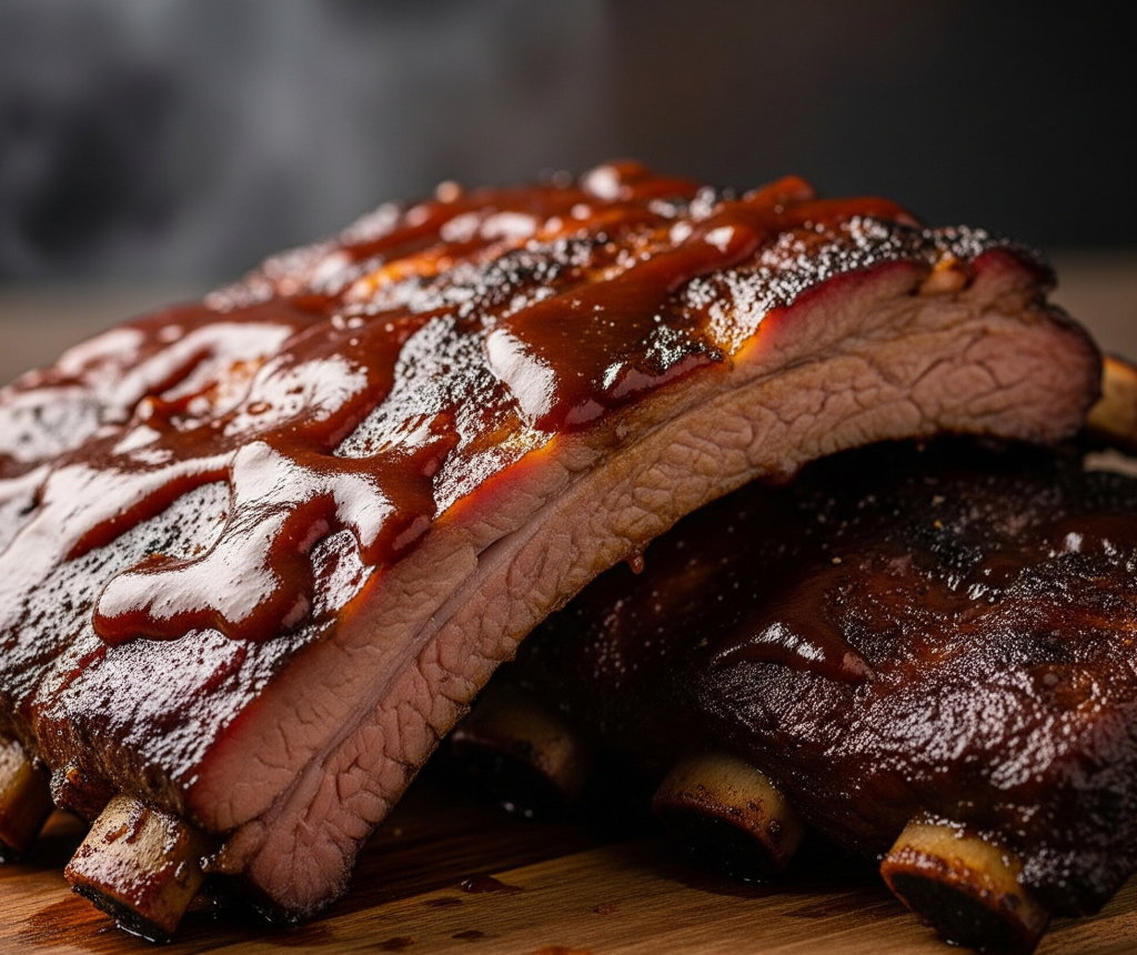 慢烤至骨肉分離的豬肋排,淋上濃郁的煙燻燒烤醬,散發著誘人的香氣。