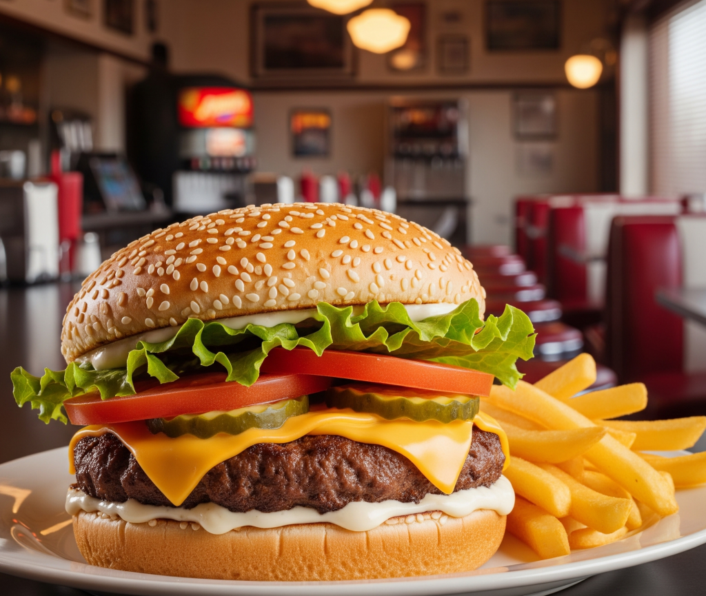 多汁的漢堡肉排、新鮮生菜、番茄、起司,夾在鬆軟的漢堡麵包中,配上酥脆薯條。簡約卻令人滿足。