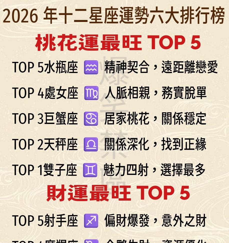 TOP 1 雙子座 ♊: 魅力四射,選擇最多。社交圈極度活躍,魅力值飆升,桃花不斷。