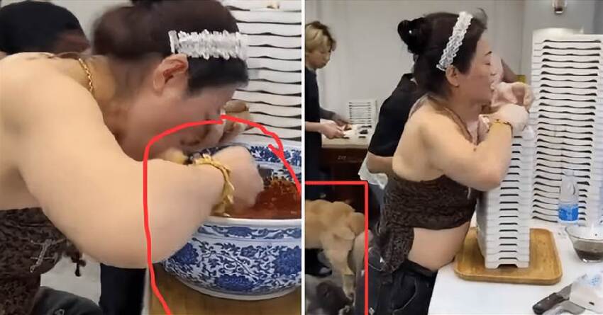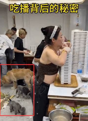 影片中可以看到,主播在鏡頭前吃得津津有味,而她的寵物狗則在鏡頭外悄悄地清理著剩下的食物。