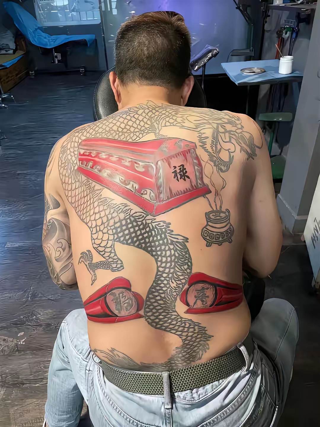 畫面中可見傳統吉祥圖案組合,但細看卻存在異常:有熟悉民俗的參與者指出,紋身本應包含福祿壽喜四大吉祥元素,但實際唯獨缺少「喜」字,進而解讀為「缺字謎——無喜,寓意這輩子沒好事」