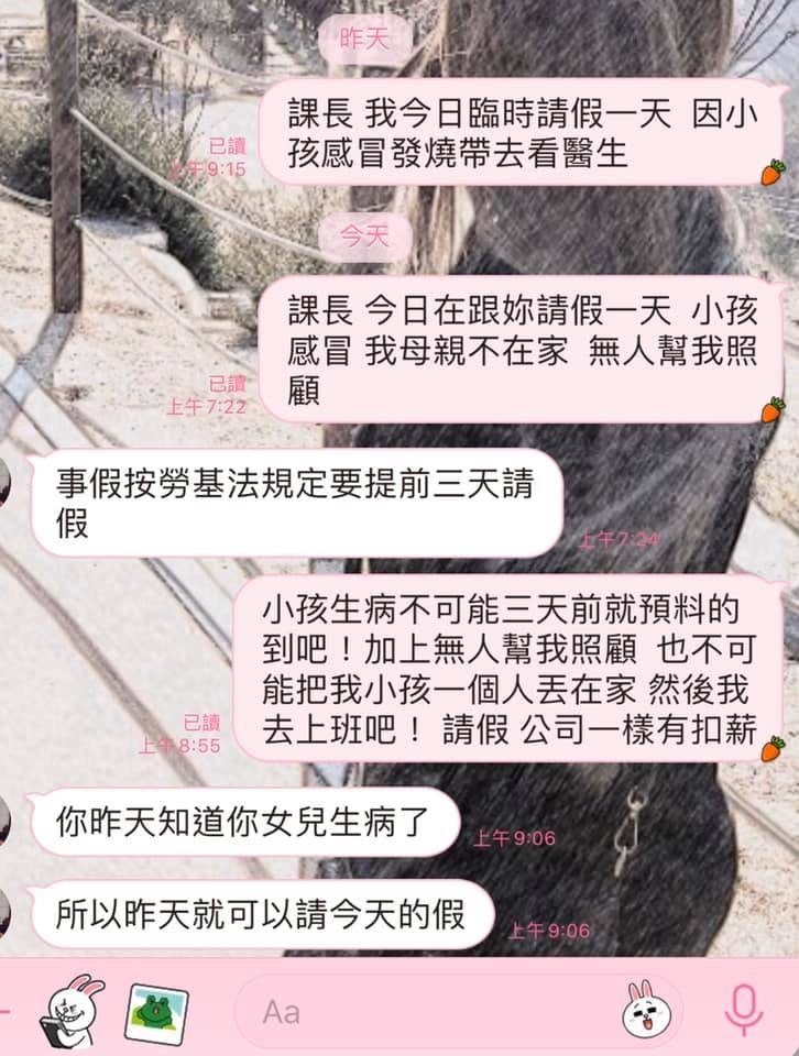 誰知,課長的回應卻令人心寒。他冷冷地回覆:「事假按勞基法規定,要提前三天請假!」單親媽媽聽聞後震驚不已,連忙回應:「小孩生病根本不可能三天前預料得到!難道要我把生病的小孩一個人丟在家嗎?」並強調請事假公司一樣是扣薪,不明白為何不能通融。