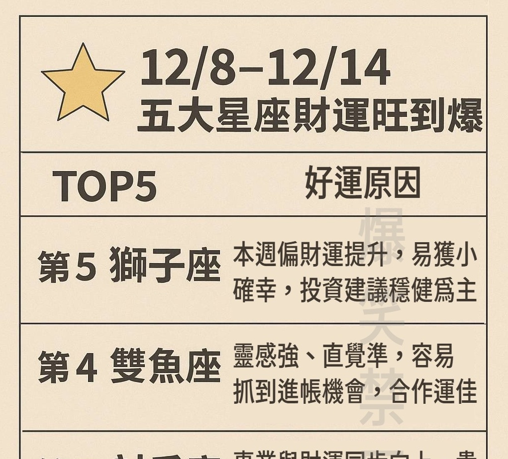 旺到爆解析: 本週獅子座的財運可說是火力全開,無人能敵!受到年底水能量的激發,您的企圖心轉化為實質的財富回報。偏財運尤其強勁,不僅有機會透過投資、彩票或意外的紅包獲得高額進帳,正財方面也因您的自信與領導力提升而表現亮眼。