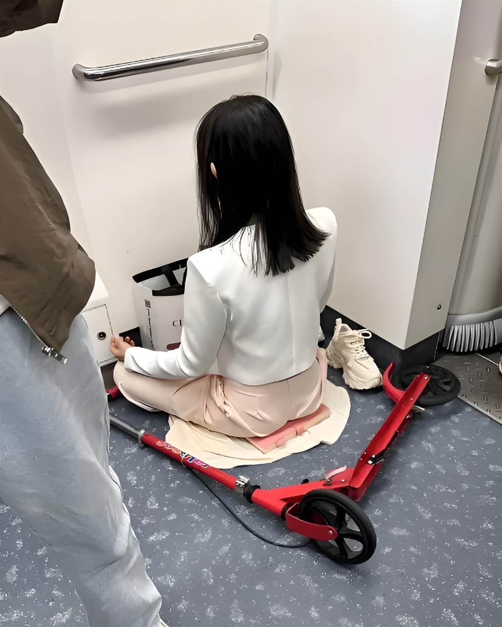 照片曝光後立刻引發熱議,許多人一開始以為她是身體不適、物品掉了,或只是單純沒有座位可坐,結果細看發現——她屁股底下竟然還墊著一塊專業用的坐墊!