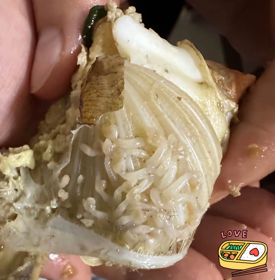 這場螃蟹腮部「白蛆」風波,經網友專業指認,實為一場由海洋附生生物「茗荷」(非寄生蟲,屬蔓足類)引發的視覺誤會。