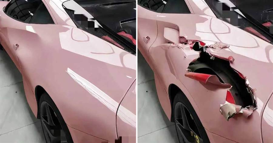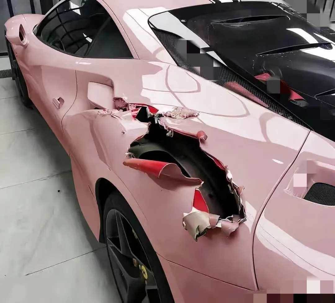這件事發生在某城市的高檔停車場。一輛粉色的豪華跑車停在一角,其時尚的車身和獨特的配色讓人一眼難忘。然而,當車主返回停車位時,眼前的景象讓他瞬間愣住:車身右后側仿佛被一股巨力撕裂,金屬板深深凹陷,涂漆幾乎被「撕成碎片」,露出車內紅色結構,畫面觸目驚心。
