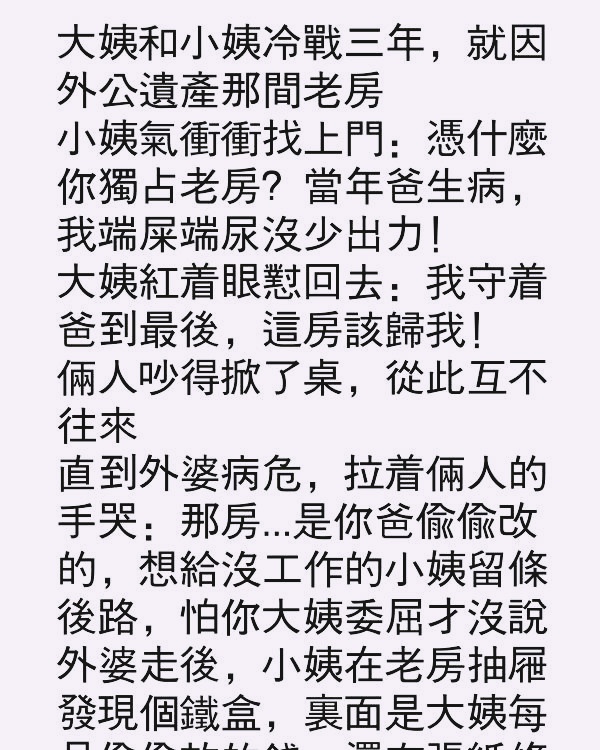 大姨和小姨冷戰三年,就因外公遺產那間老房。