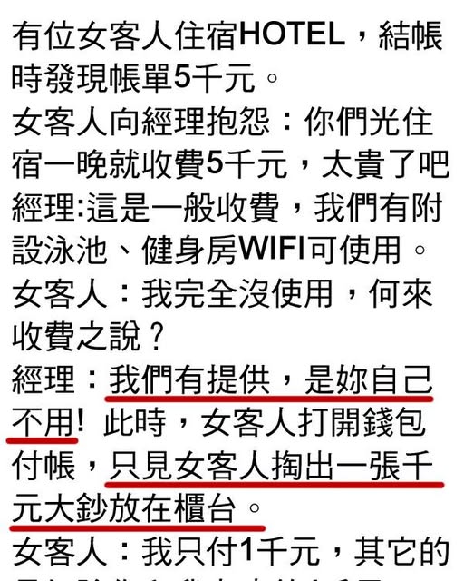 女客人向經理抱怨:你們光住宿一晚就收費5千元,太貴了吧經理:這是一般收費,我們有附設泳池、健身房WIFI可使用。女客人:我完全沒