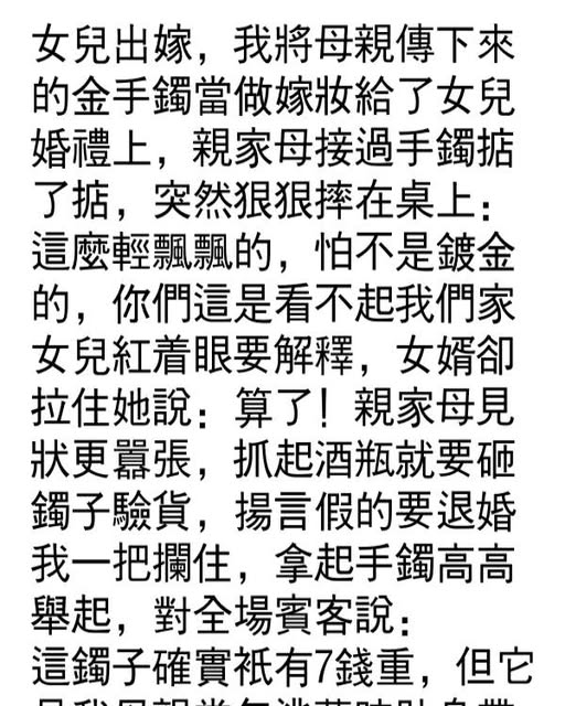 我一把攔住她,拿起手鐲高高舉起,對全場賓客說:“這鐲子確實只有七錢重,但它是我母親當年逃荒時貼身帶着的念想,是我結婚時唯一的嫁妝, 如今傳給我女兒,裝的是三代女人對家的堅守。金有價,情無價,您要驗的是金,我護的是心!”