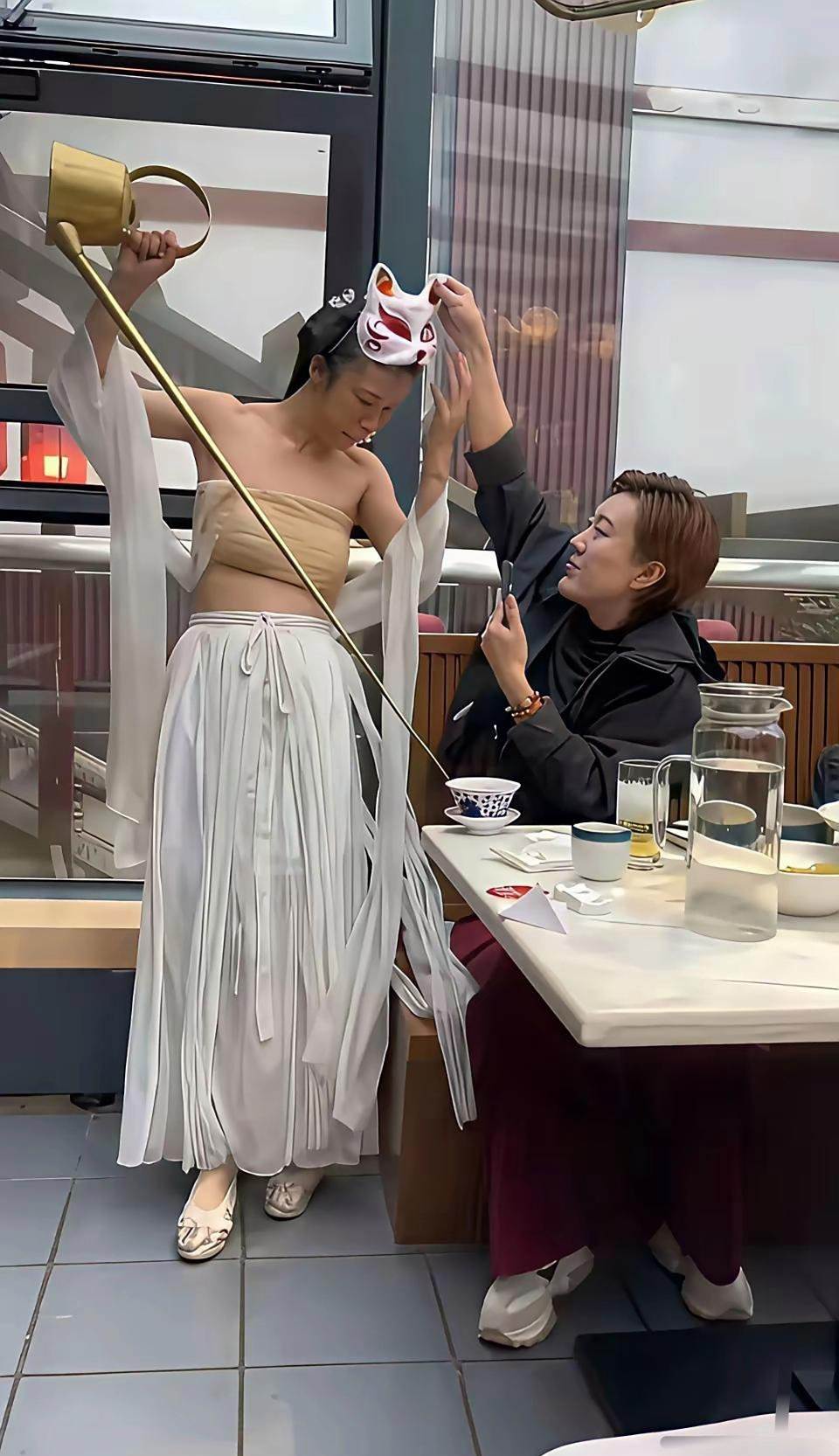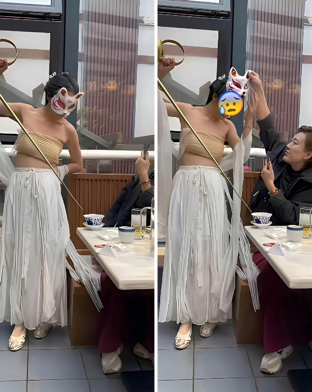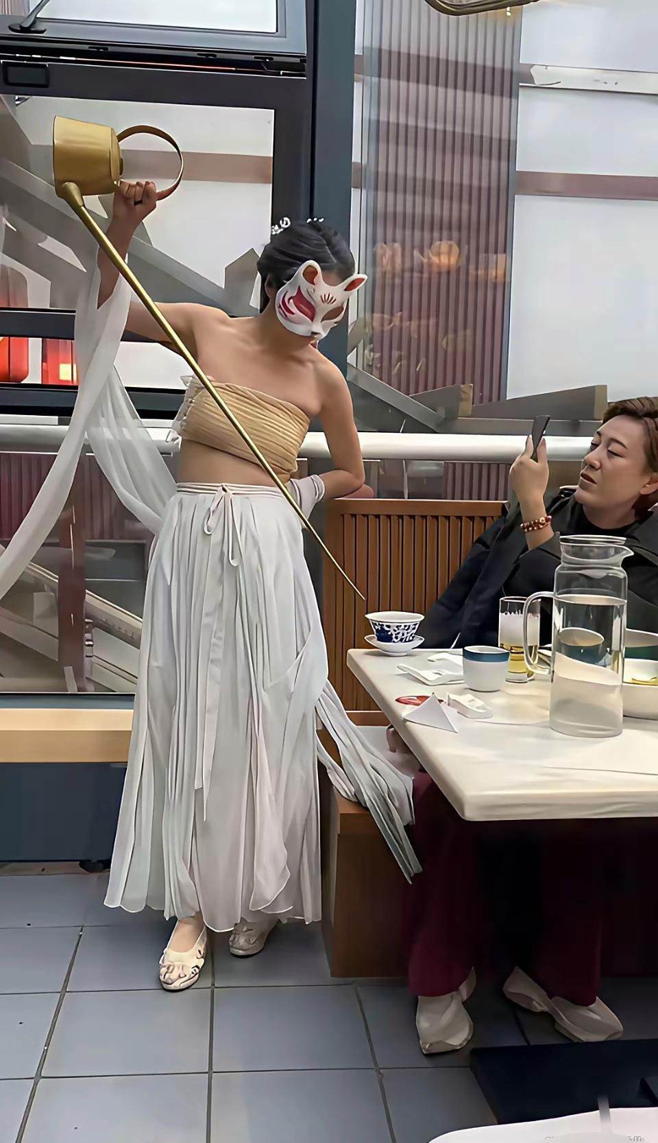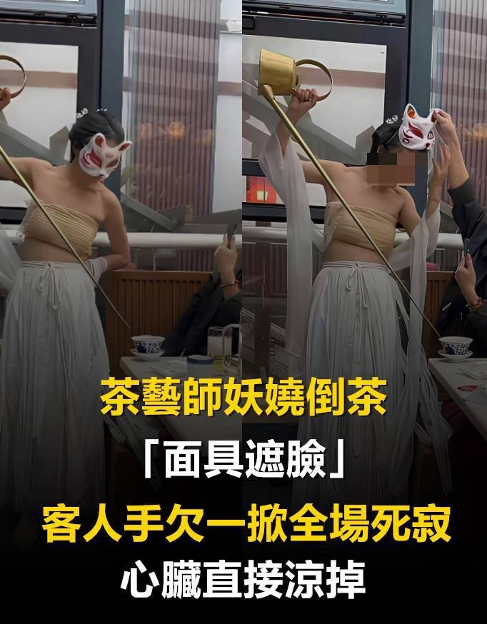 但最特別的是——她臉上戴著半張面具,只露出紅紅的唇跟下巴。那面具是霧面黑色的,襯得她手腕在倒茶時更白,水柱拉高又慢慢收回,茶湯在青瓷杯裡繞出一圈金邊,優雅得誇張。旁邊桌的人忍不住小聲讚嘆: