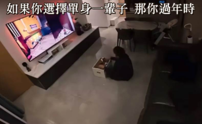第一張圖片描繪了單身者獨自過年的畫面:一個人坐在電視機前,客廳冷清,背影顯得有些落寞。這張圖原本想表達單身在節慶時的孤寂感,藉此推動脫單的衝動。