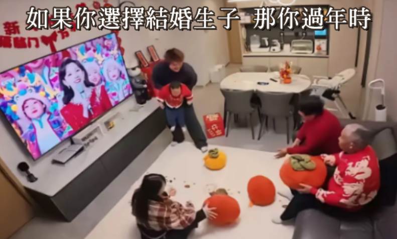 第二張圖片則呈現了典型的三代同堂賀歲圖:全家人圍坐在電視前,小孩嬉鬧、長輩閒聊,畫面充盈著滿滿的溫馨與幸福感,令人嚮往家庭帶來的安定感。