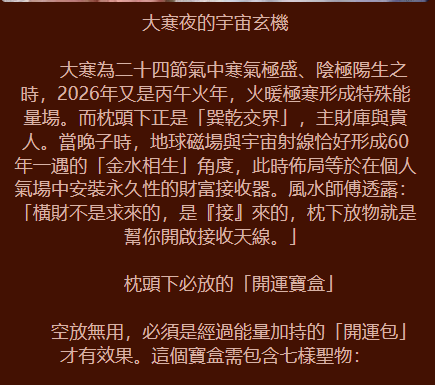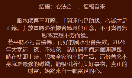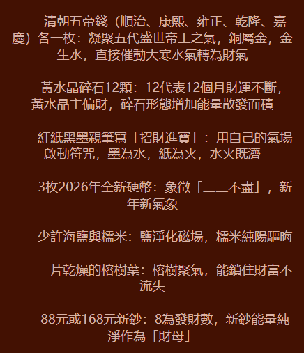 2026 財富預測: 你的財運來自「人脈財」。明年你不需要太辛苦,財富會透過「合作」或「介紹」自動上門。你那種**「不爭而獲」**的特質,會讓你在 2026 年底積累出一筆可觀的跨年私房錢。