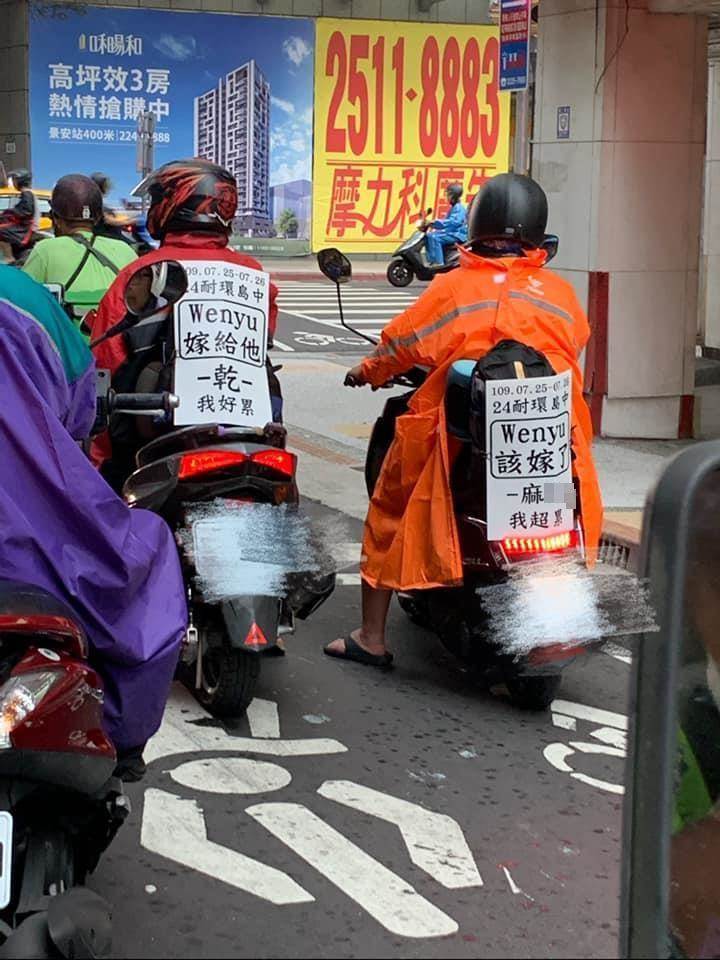 這兩位朋友同樣背著板子,和男子一起進行了這場24小時環島挑戰。他們的板子上也寫著支持的字句,「Wenyu嫁給他」、「Wenyu該嫁了」,幫忙給好友加油打氣,顯示出滿滿的兄弟情。
