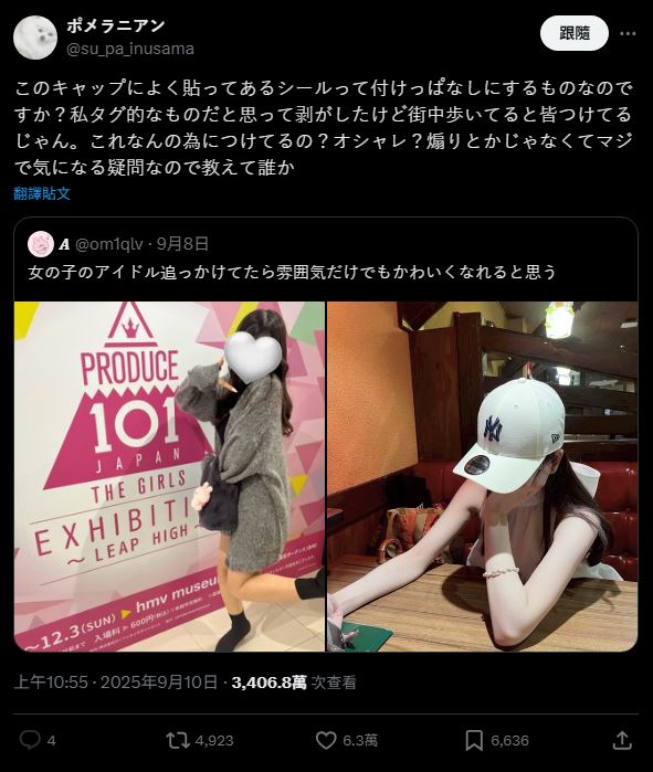 近日,一張「棒球帽穿搭照」在網路上意外掀起話題。一名網友在滑社群平台時,發現照片中的可愛女孩戴著棒球帽,帽簷上竟然還留著一張圓形貼紙,忍不住發問:「這種帽子上的貼紙不用撕掉嗎?」沒想到這個疑問,竟引爆上萬網友熱烈討論。