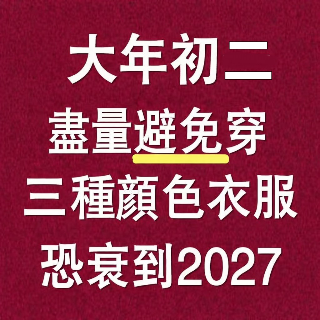 由於 2026 丙午年火氣旺盛,對於 生肖蛇、豬、猴、雞、牛 的朋友,初二這天若再穿大紅色,容易火氣過旺,導致情緒失控或財損。