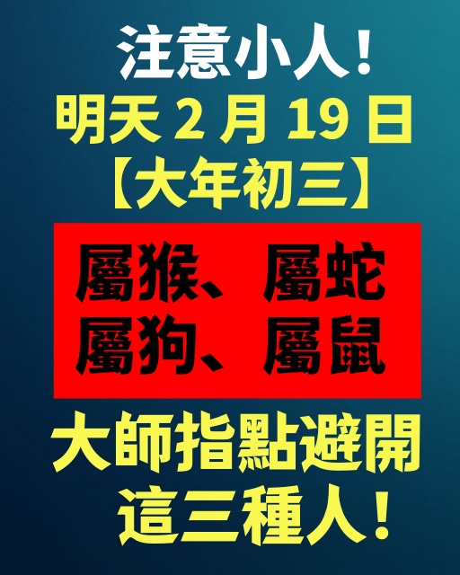 明天 2 月 19 日大年初三,赤狗日帶來口舌是非之氣,屬猴、屬蛇、屬狗、屬鼠這四大生肖,財運雖旺卻易遭小人攪局,大師特別點名,這三種人千萬要躲遠,別讓小人毀了你們的暴富之路!