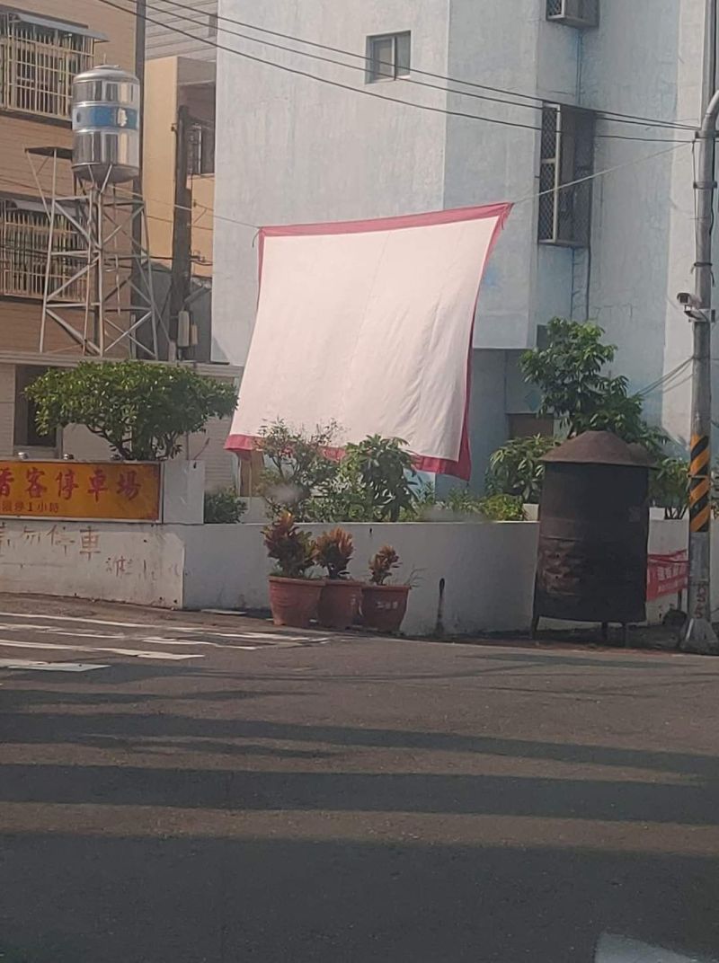 最近有一名網友在臉書社團「爆廢公社」分享一張照片,引起不少討論。畫面中是一處看起來像宮廟附近的場地,旁邊有「香客停車場」的招牌,圍牆外還能看到金爐,環境相當典型。最吸睛的是畫面中央,一塊四周有紅邊的大白布,就這樣高高掛在空中,看起來既突兀又神秘。