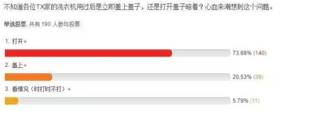 日前有網友詢問,家裡洗衣機用完之後,一般都是把蓋子蓋上,但是聽人說洗衣機用完「最好把蓋子打開」,他有些弄不明白?相信不少朋友都有這個困惑,小編還看到有網友特地為此做了一個小調查!