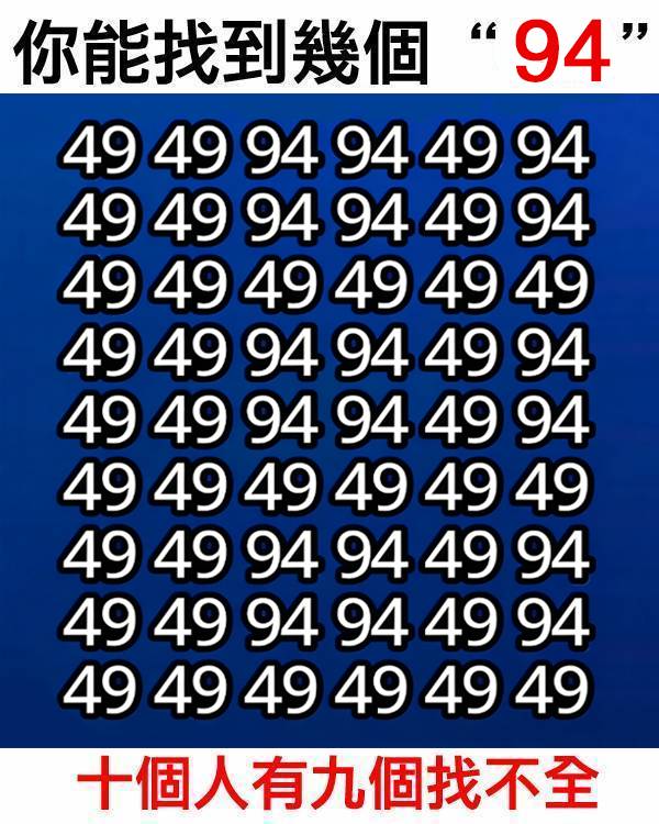 這是一場關於「眼力」與「專注度」的趣味挑戰!在這張密密麻麻的數字圖中,隱藏著多個「94」,而大多數人往往會因為視覺疲勞或規律性的干擾而數錯。