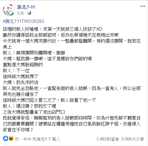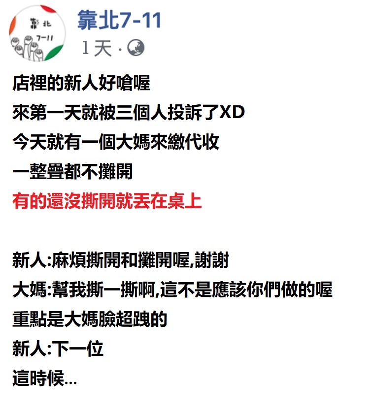 根據報導,一名網友在臉書「靠杯7-11」分享,自己上班的超商門市來了一個新人,在第一天上班時遇到要繳代收的大媽客人,但沒想到這個大媽一到櫃檯就把整疊帳單丟上來,全都疊在一起沒有攤開,有些甚至還沒有拆信,這時新人便直接地告訴對方:「麻煩撕開和攤開喔,謝謝」。