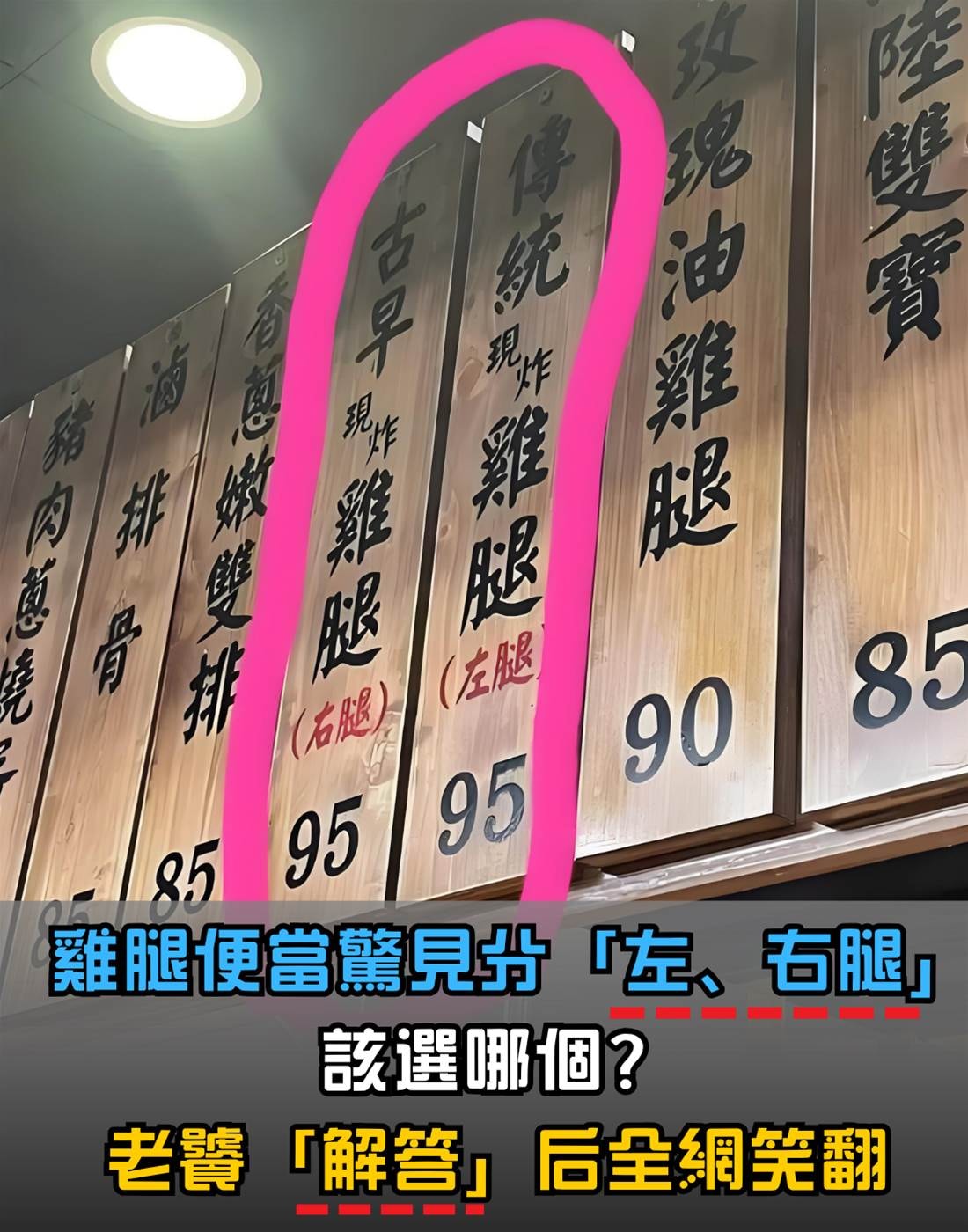 老闆一聽,先愣了兩秒,接著笑出聲說:「你想吃哪一隻都行啦,雞只有兩條腿,我只是懶得改字,結果客人都被搞糊塗!」原來這家店之前仕貨不穩,有時左邊炸鍋出餐比較快,就乾脆標「左腿」,另一鍋標「右腿」,方便區分。沒想到一傳十、十傳百,竟變成店裡的「神秘菜單」,還有人專程來問差在哪裡。