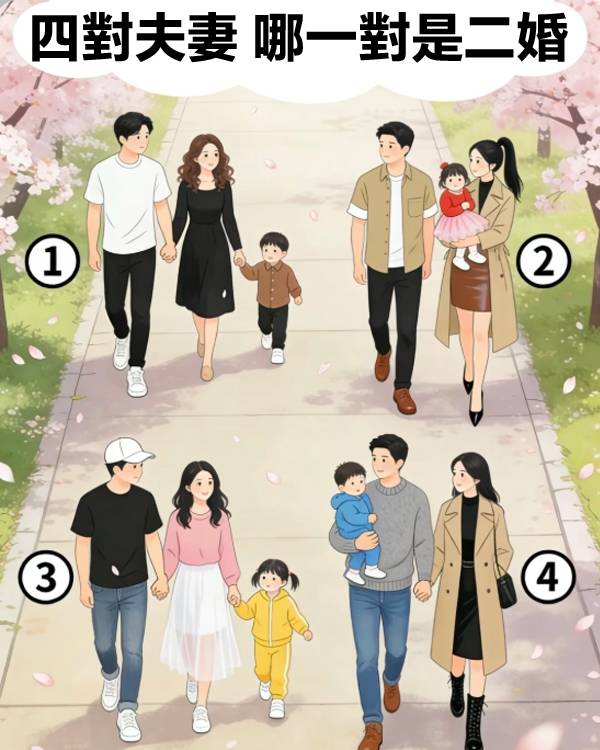② 號夫妻:父親的手插在口袋裡,與母親並肩而行但沒有肢體接觸,母親獨自抱著孩子。這種明顯的距離感常被解讀為「重組家庭」的象徵,可能暗示父親與孩子的親密度尚在建立中,或者彼此更注重個人空間。