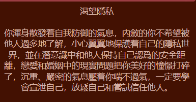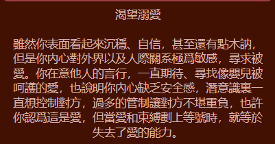 建議: 給自己放個假,多與家人或最信任的朋友相處。尋找能讓您感到舒適、放鬆的環境,重新充滿內在能量。