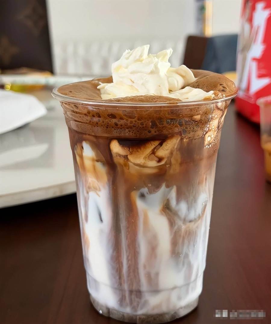 這跟咖啡有什麼關係?拆解成分你就會背脊發涼:這裡面幾乎沒有咖啡的痕跡。它的主體是「冰塊+加糖的奶漿+植脂末(非乳制奶油)」,頂部的奶油全是植物淡奶油打發出來的,焦糖醬更是純粹的糖漿。