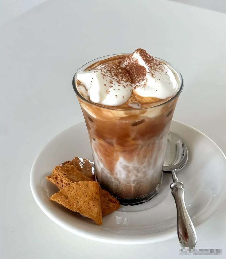 以各種星冰樂、冰沙為代表的特調飲品,是發動態的最佳道具。顏值高、冰涼解渴,但你仔細看看它的結構:底下一層是冰塊,中間是深褐色的液體,上面堆著高高的奶油,再淋上一層焦糖醬。