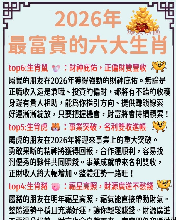 屬雞的朋友榮登榜首!2026年你們的整體運勢最旺,財星高照,簡直是擋都擋不住。不僅正財豐盈,事業上的收入和獎金大幅提升,偏財運也表現出色,有機會獲得意外之財。事業家庭雙美,福氣滿滿,是名副其實的「富貴之王」!